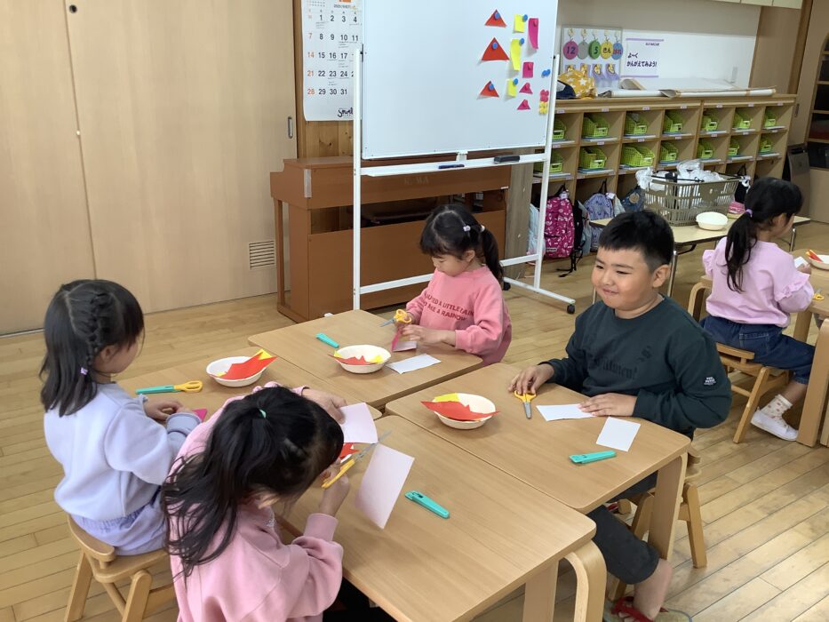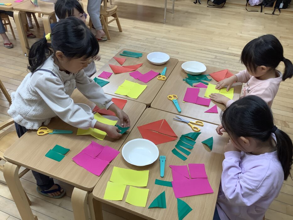 1枚の折紙から「大きい三角1つと中くらいの三角2つを作ってね。」「長四角4つと小さい三角4つに出来るかな?」という課題に挑戦しました!