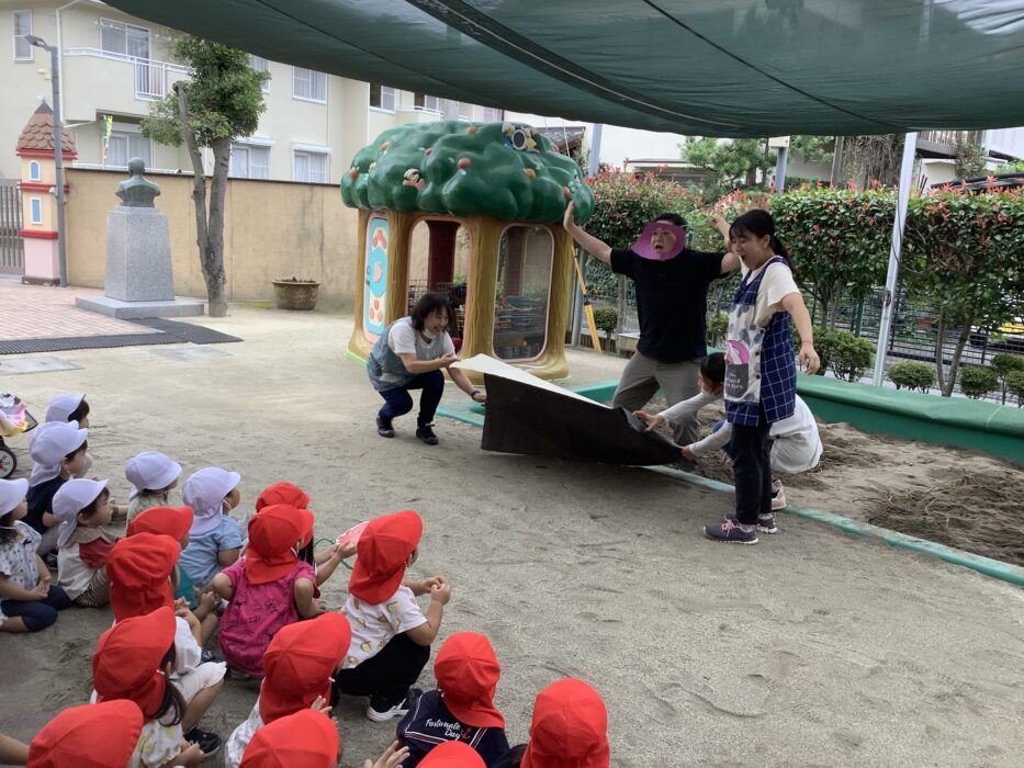 今日は園庭でみどり、しろ、あかぐみでお芋掘りごっこをしました。先生が、お芋は土の中にあるからツルを引っ張って掘ってみてね!と劇をしてわかりやすく教えてくれました。