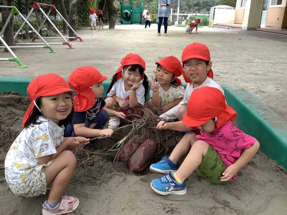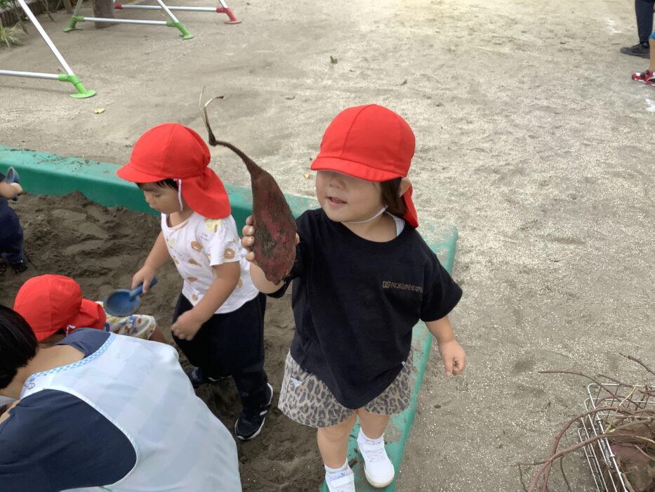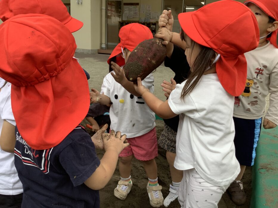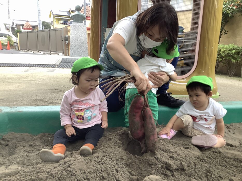 1番小さいみどりぐみさんは少しドキドキ…〝これなに〜!〝とビックリして先生にぎゅっと抱っこされるお友達や、〝…んんんん。〝とお芋を見つめるお友達…。そんな姿もとっても可愛いですね♡