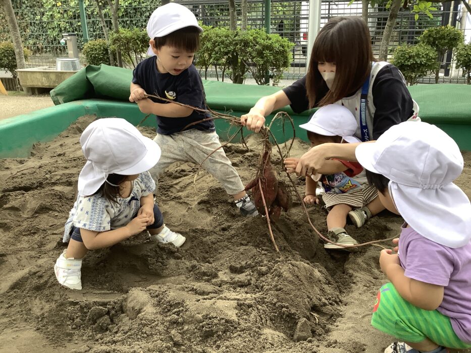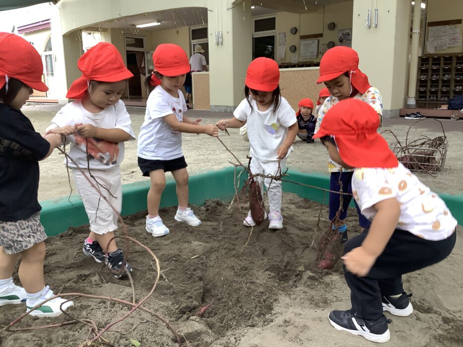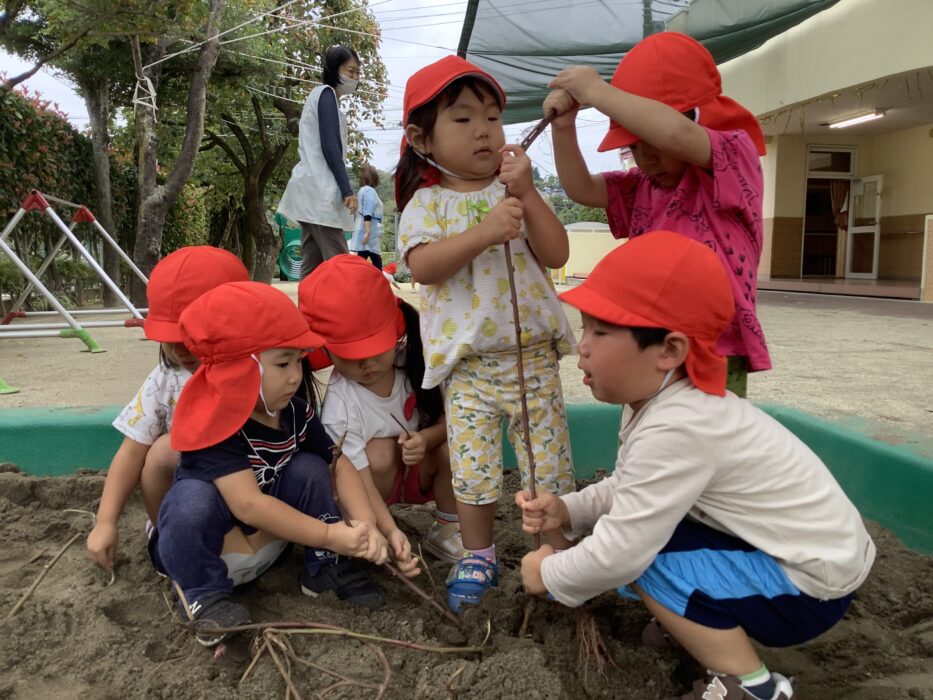 しろぐみさんのお友達は興味津々!えいっ!とツルを引っ張って先生と一緒にお芋掘りを楽しんでいました!
