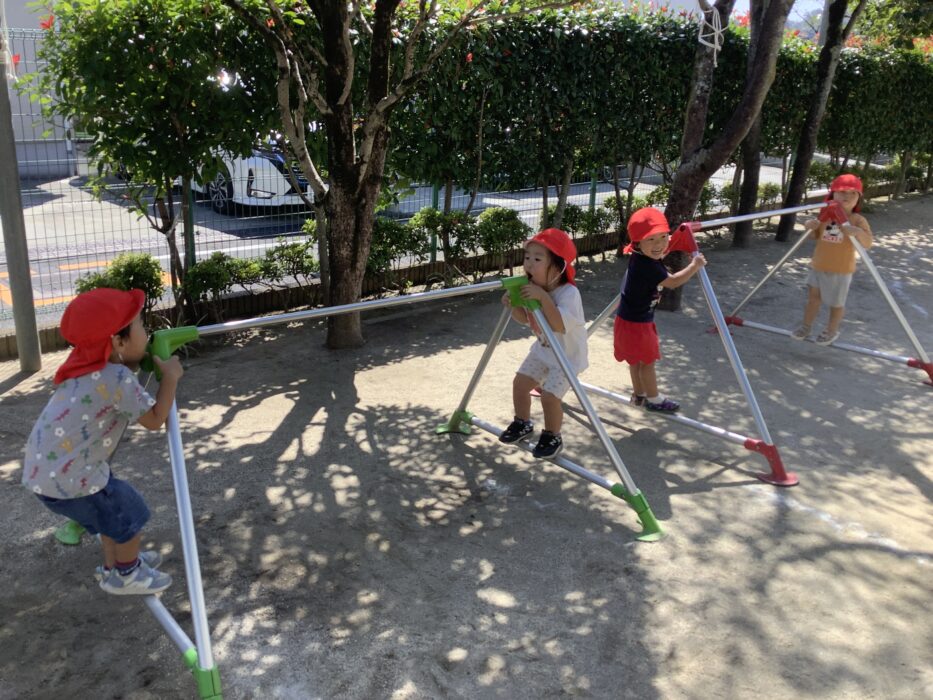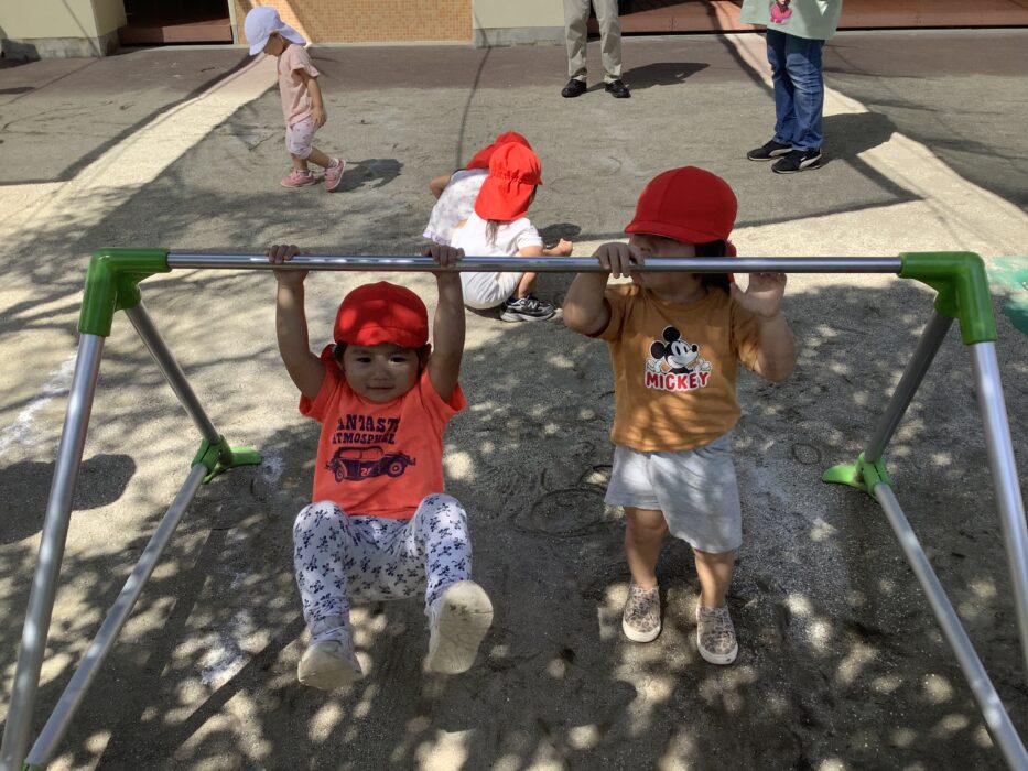 鉄棒では、「みてみてー!!」とぶら下がってニコニコ!隣の友だちを見て僕も!私も!の気持ちでみんなぶらぶら〜😊