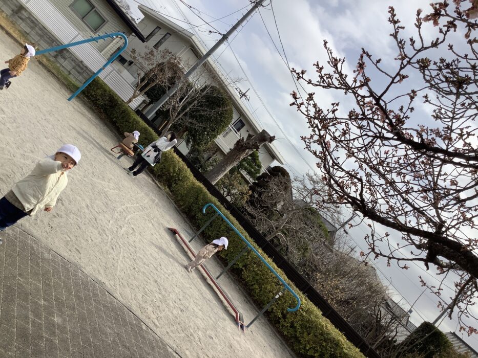 「あっ!」とさくら🌸が咲いているのを発見!春の訪れるを感じることが出来ました!満開になったらまた遊びに来ようね🩷