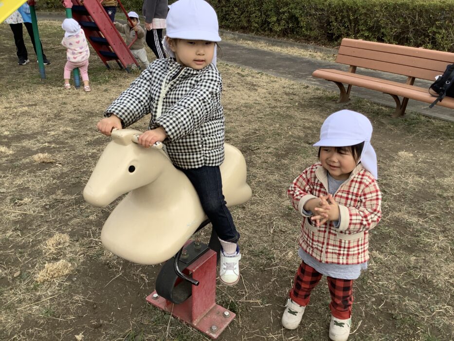 すべり台や動物シーソーでは「じゅんばんこ」「かしてー」など保育者が声をかけるとスムーズに出来るようになってきました。