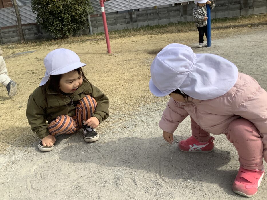 お絵描きタイム。「アンパンマンだよ」「これドラえもん」とおしゃべりも楽しんでいました。お絵描きした手は砂ぼこりでまっしろとなってしまいましたが、気にする事なくお絵描きに夢中でした。