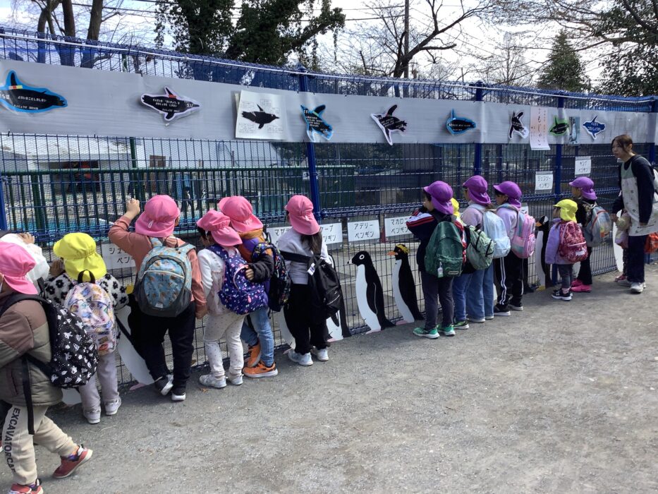 見たい動物のコーナーに着くと、「わぁ〜いた〜✨✨」と駆け寄りじっくりと観察を楽しむ子どもたち。ペンギンコーナーでは、「え!?ふじぐみさんより大きいペンギンがいるんだって!」と新たな大発見で盛り上がる姿も見られました😊