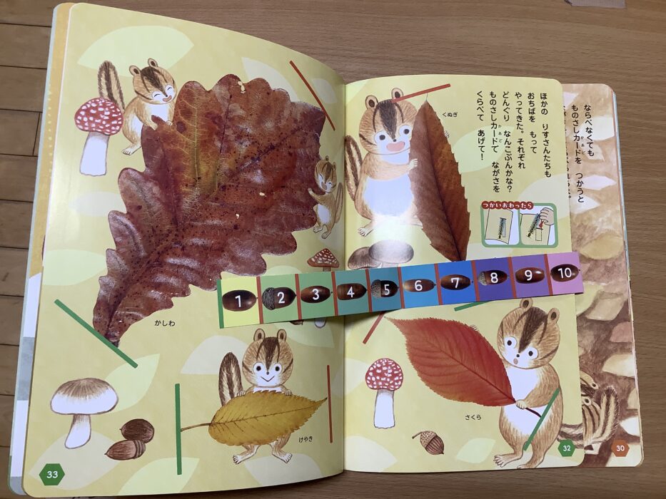 今回はものさしカードという付録を使い、本の中の葉っぱの大きさを測って発表したり、ふじぐみの部屋の中のものを測ってみたりして遊びました✨
