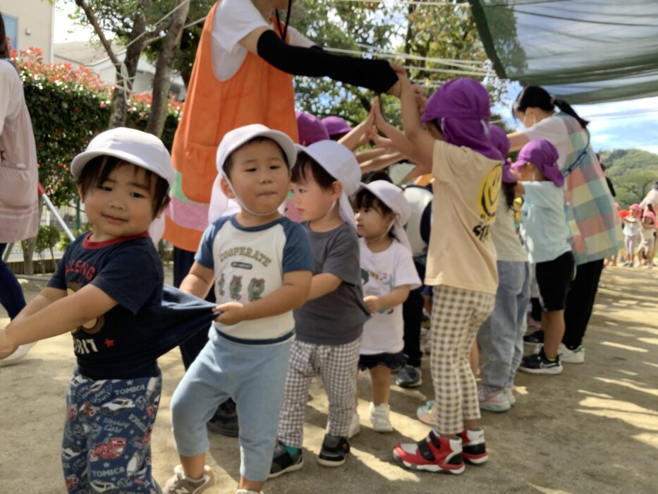 最後は、線路は続くよの曲に合わせて歩き、ふじぐみさんが作ってくれたトンネルを