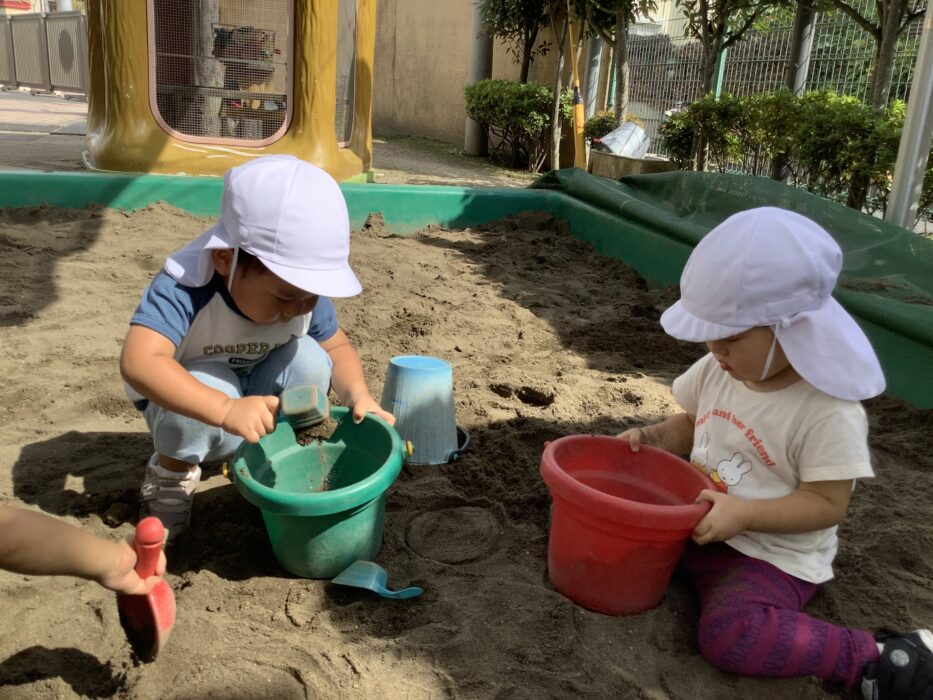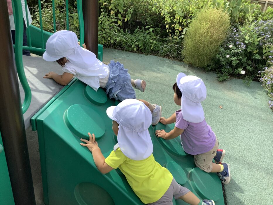 自力で斜面に登り、上から手を振ったり、お友だちと一緒に砂場遊びを