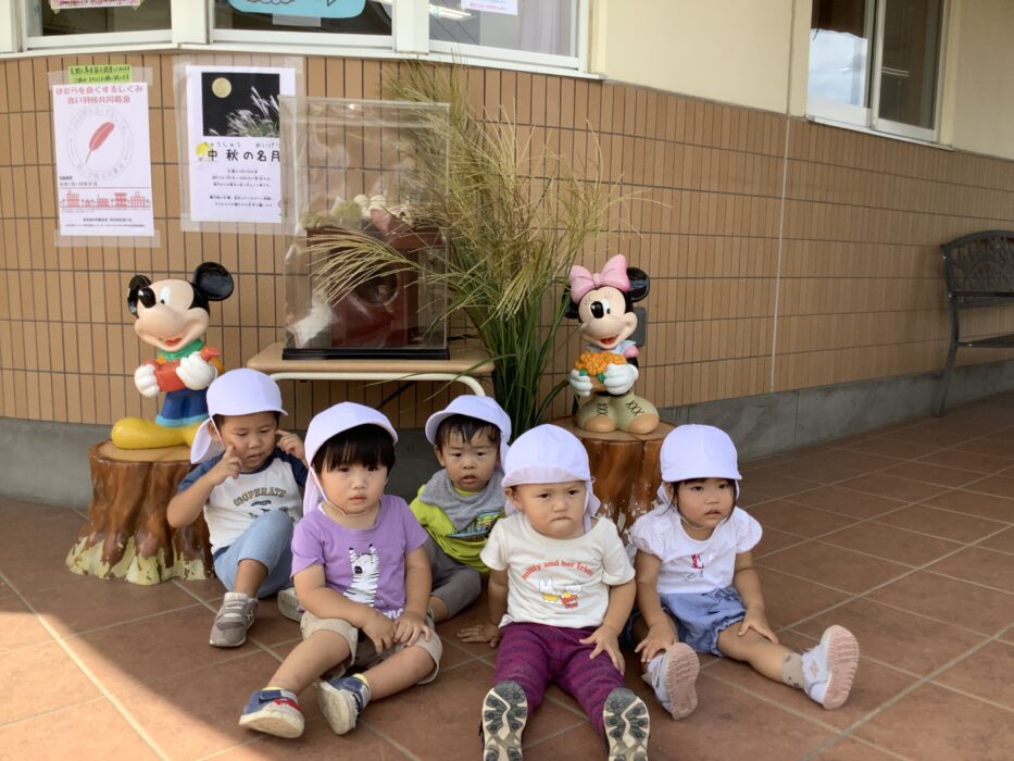 玄関前に飾ってあるお供えのお月見団子やさつまいもを見てその前で写真を撮りました♪