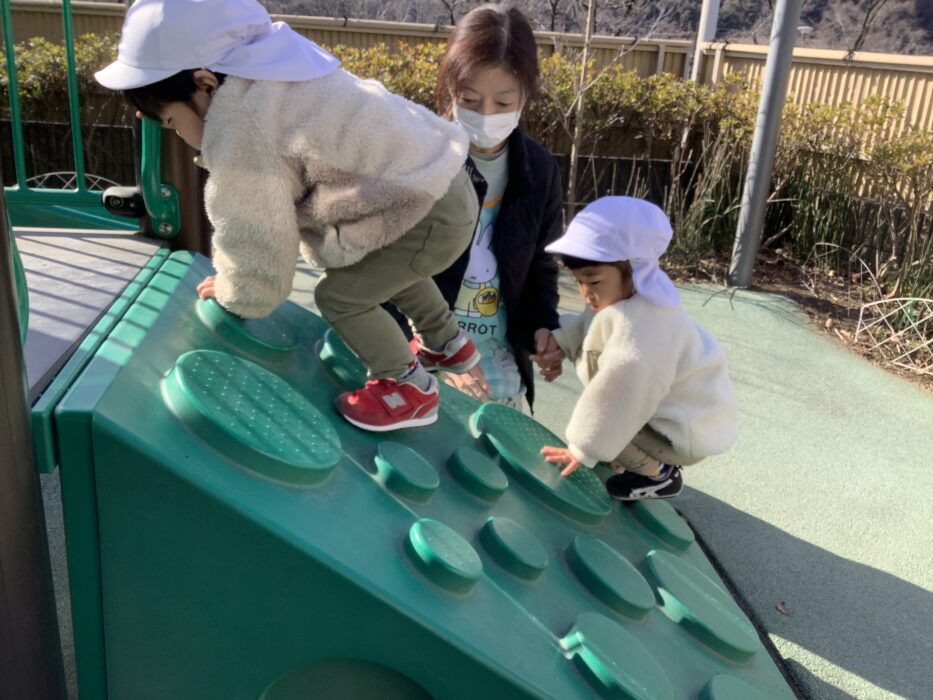 滑り台の傾斜もスムーズに登れるようになりました。登り切ると「おーい」「やったー」と大喜び!何度も楽しんでいました。