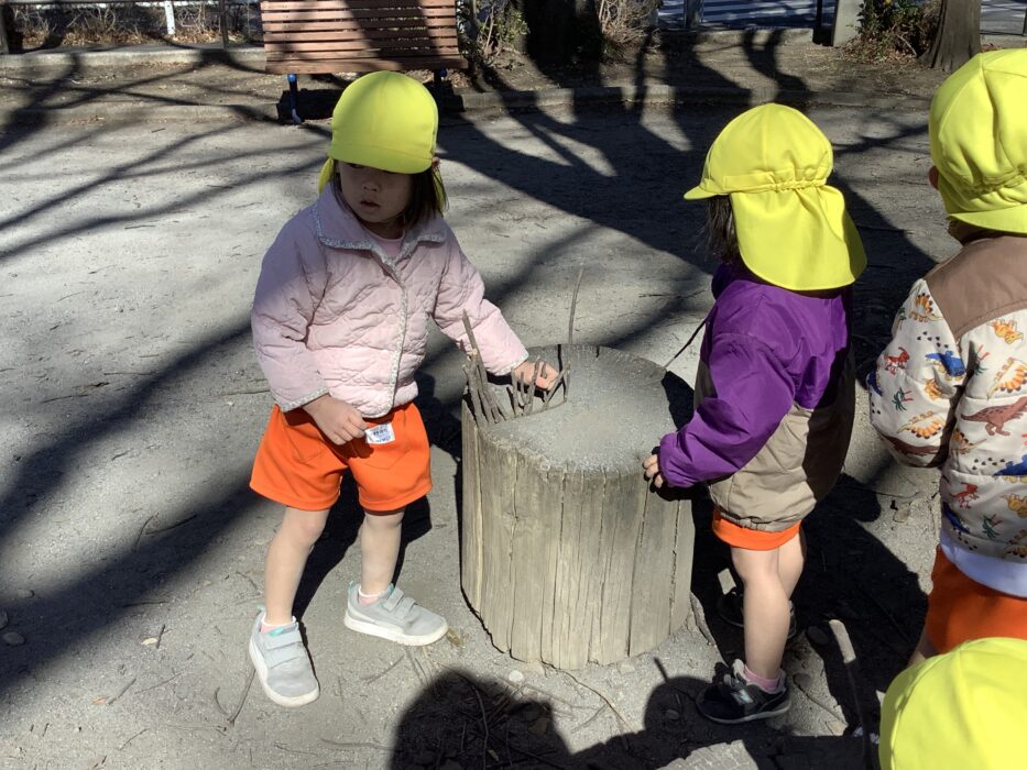 静かだと思ったら丸太の隙間に枝を黙々と刺していました(笑)