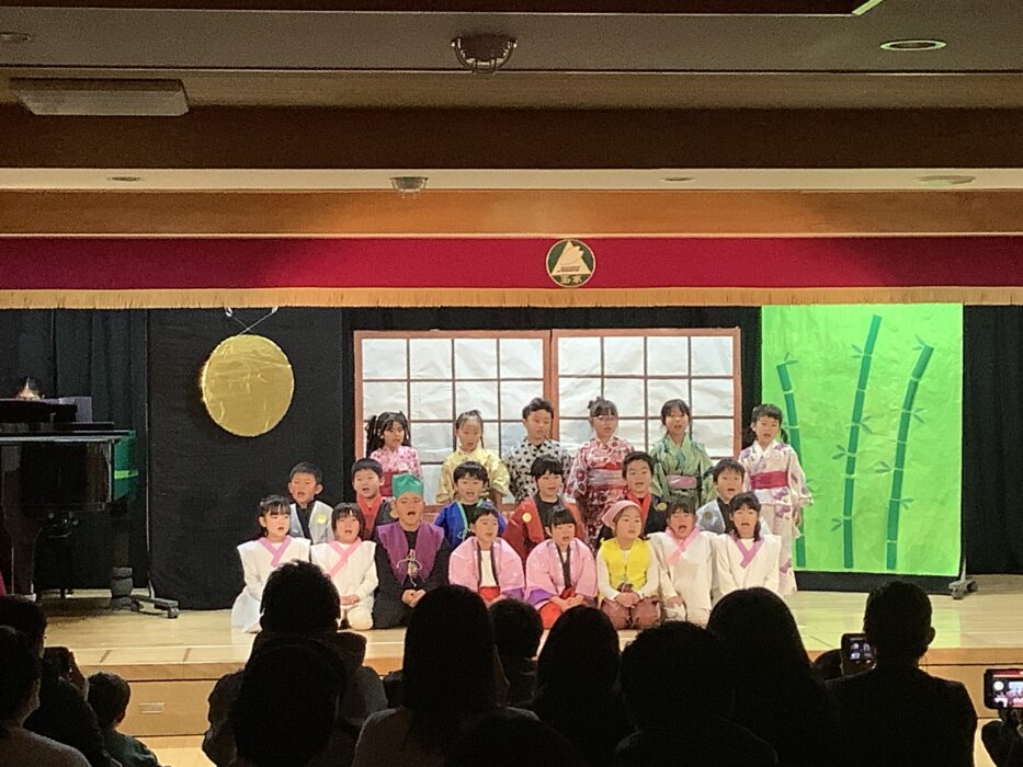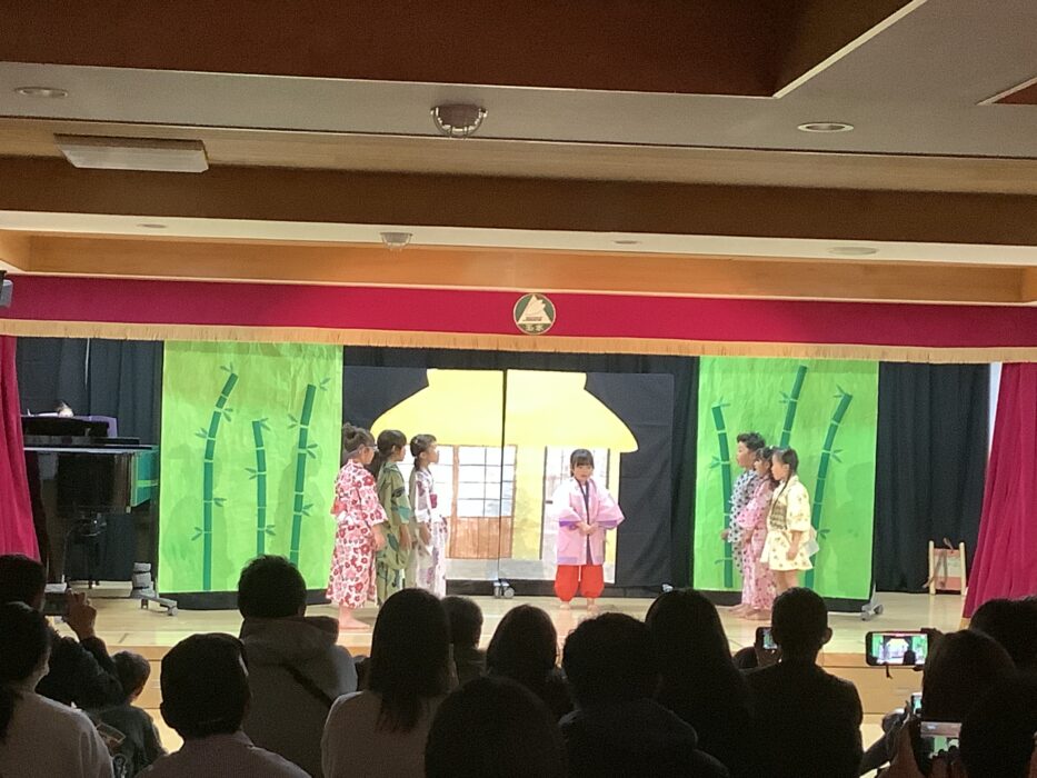 日本の昔話「かぐや姫」演じました。子どもたち一人一人が役になりきっていて本当に素晴らしかったです!難しいセリフを覚えて大きな声で言ったり、場面や背景の転換も自分たちだけで行なっている姿は本当に頼もしい年長児でした!