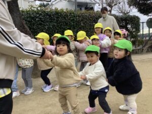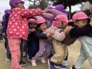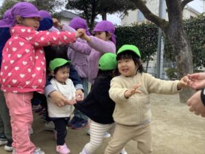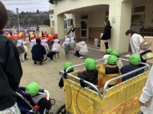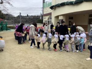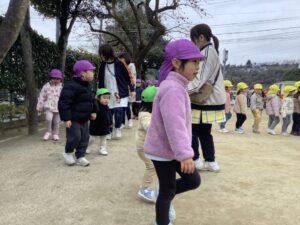 みどりぐみの子どもたちは、寒さに負けず全園集会に参加しました。