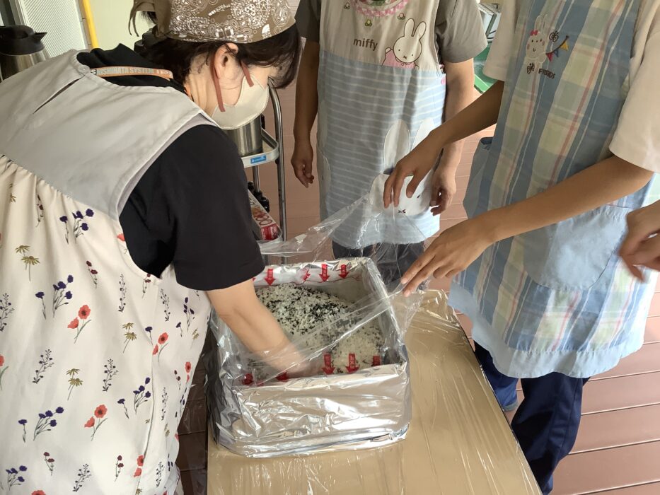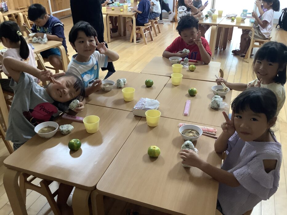先生たちがおにぎりも一生懸命作ってくれてお昼が待ち遠しい子どもたちです。