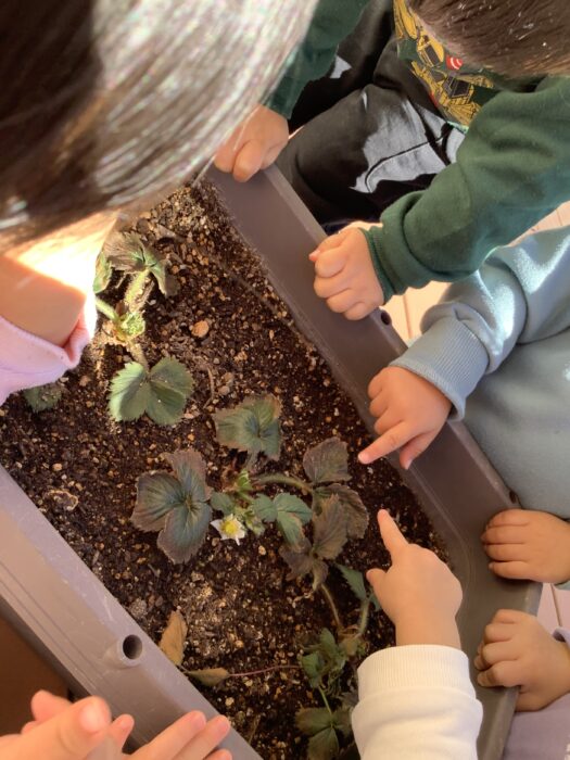 子どもたちも花を見て、「おおきくなーれ!」とお願いしたり、「ピンクのいちごがいいなぁ」
