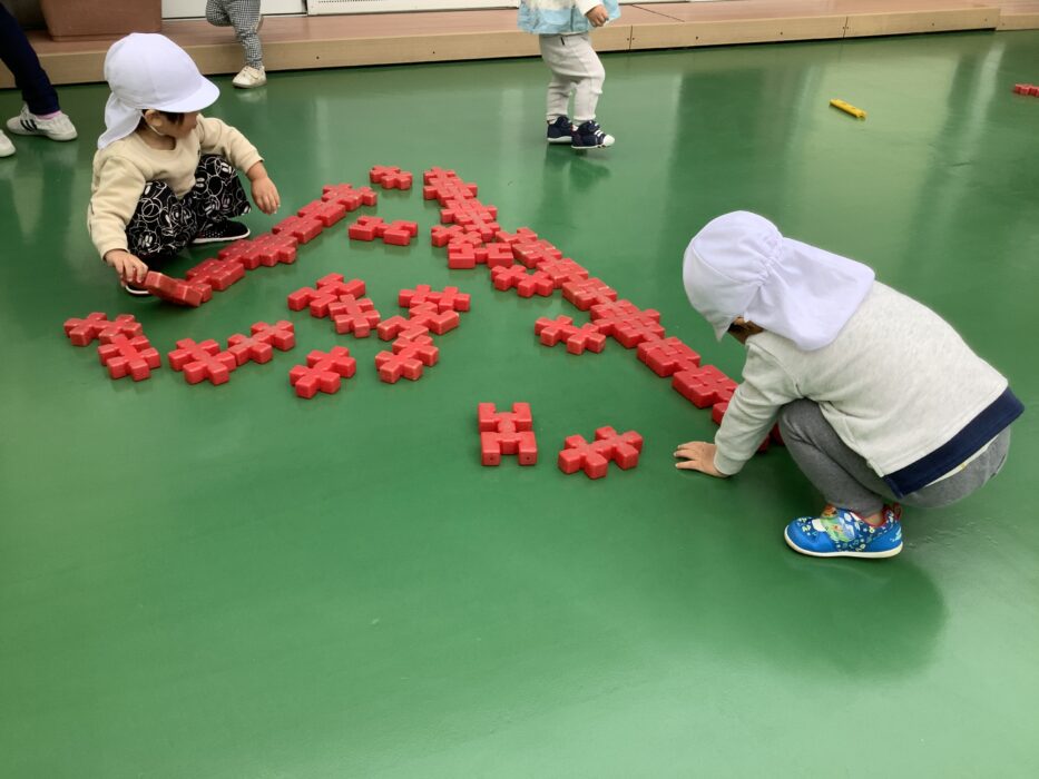 なが〜くつなげて線路の完成。お友達と協力して遊んでいました。