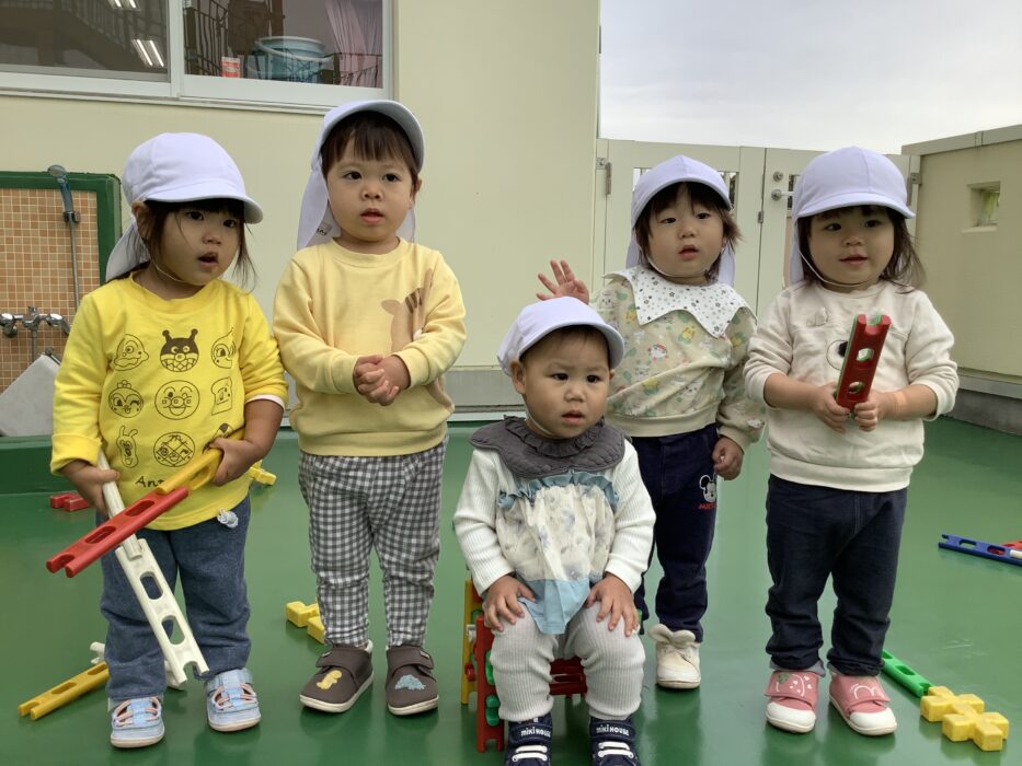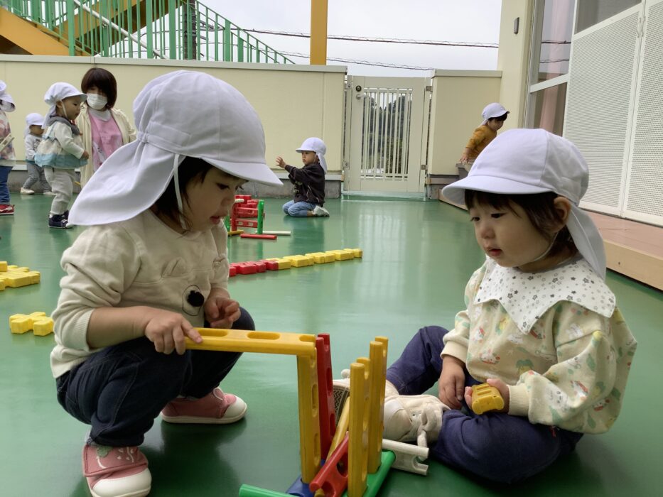 今日はきいろぐみの前のテラスでブロックを出して遊びました。