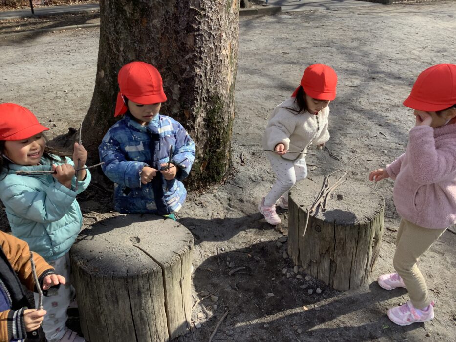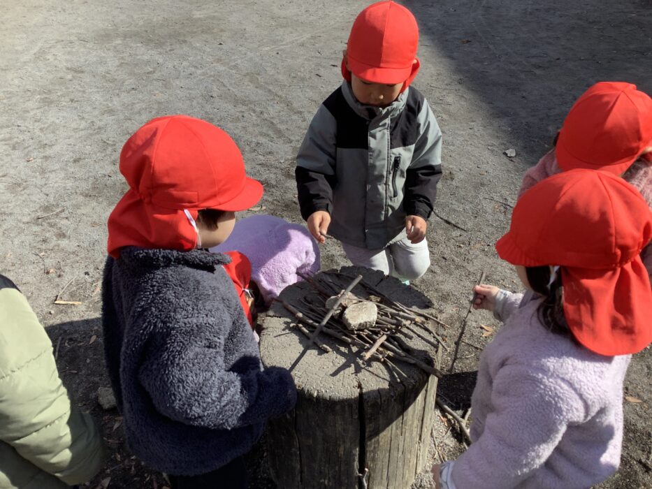 また、旭ヶ丘公園には、木の枝や石が沢山あり、自然でいっぱいです。今日は切り株の上で枝と石を重ねて『やきいもやさん』の見立て遊びをしていました!